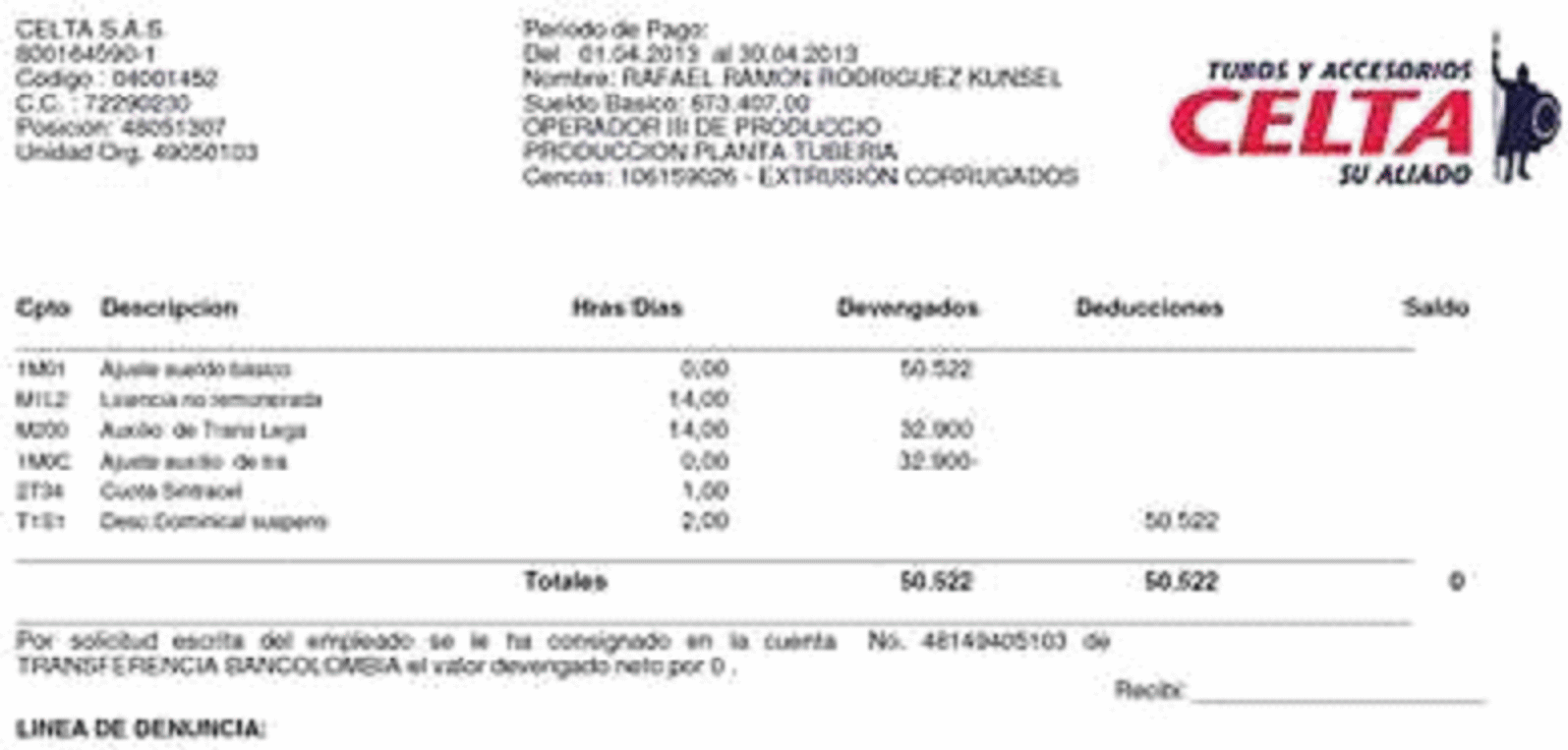 La demandante sostuvo que la administración dejó de lado que este trabajador estaba en licencia no remunerada y no tenía ingresos registrados durante los periodos de enero a abril de 2013; en consecuencia, Celta S.A.S. canceló aportes sobre 1 SMLMV, sin incurrir en un error o inexactitud; para ello allegó al expediente los desprendibles de pago.