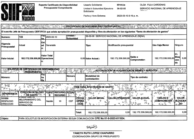 Certificado de Disponibilidad Presupuestal No. 123, de marzo 10 de 2023, por valor de CIENTO NOVENTA Y DOS MIL CIENTO SETENTA Y DOS MILLONES TRESCIENTOS TREINTA Y SEIS MIL QUINIENTOS PESOS ($192.172.336.500) m/cte. para garantizar la existencia de apropiación suficiente para atender la modificación del presupuesto.