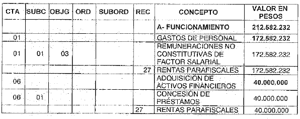 ARTÍCULO 2o. <Acuerdo derogado por el artículo del Acuerdo 11 de 2019> Acreditar el presupuesto de Gastos de Funcionamiento para la vigencia fiscal de 2019 por valor de DOSCIENTOS DOCE MILLONES QUINIENTOS OCHENTA Y DOS MIL DOSCIENTOS TREINTA Y DOS PESOS ($212.582.232) M/CTE, en las siguientes Cuentas, Subcuentas, Objeto del Gasto, Ordinal, Sub ordinal, Recurso y valor en pesos: