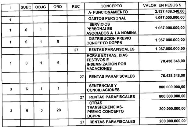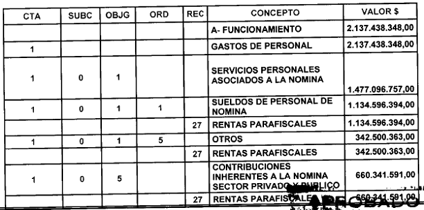 ARTICULO SEGUNDO. Acreditar el presupuesto de Egresos Ley para la vigencia fiscal de 2012 por valor de DOS MIL CIENTO TREINTA Y SIETE MILLONES CUATROCIENTOS TREINTA Y OCHO MIL TRECIENTOS CUARENTA Y OCHO PESOS ($2.137.438.348,00 ) M/CTE M/CTE, en las siguientes Cuentas, Subcuentas, Objeto del Gasto, Ordinal, Recurso y valoren pesos:
