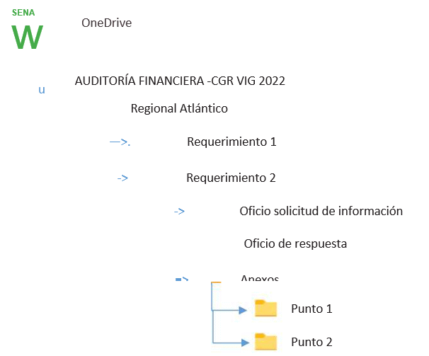 La Oficina de Control Interno dispone a través de Office 365 - OneDrive, una carpeta de almacenamiento denominada “AUDITORÍA FINANCIERA -CGR VIG 2022”, que cuenta con subcarpetas por las Regionales que serán sujeto de Auditoría. En estas carpetas los enlaces dispondrán de toda la información asociada a los requerimientos, sus respuestas y anexos así:
