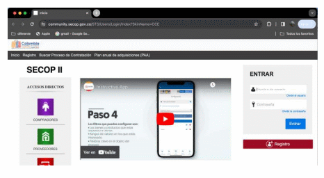 Para poder acceder a la plataforma de SECOP II debe ingresar al navegador y acceder a la url: https://community.secop.gov.co/STS/Users/Login/Index?SkinName=CCE e ingrese su usuario y contraseña.