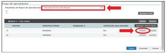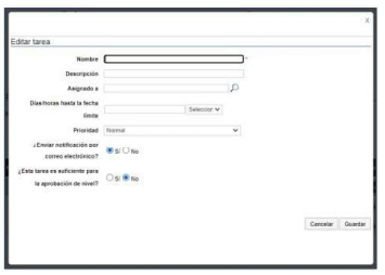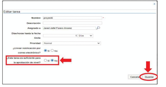 11. Antes de Guardar la tarea del Flujo, debe asegurarse que si el mismo no es el del ordenador del gasto en la opción "esta tarea es suficiente la aprobación de nivel" se encuentre seleccionado "NO"