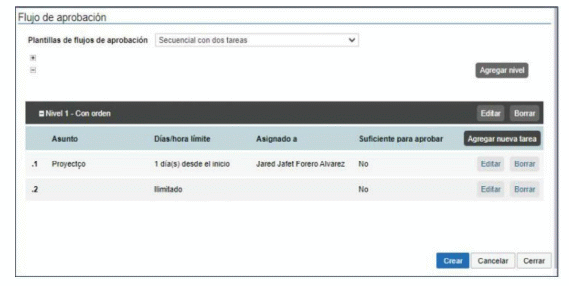 9. El portal trae por defecto 2 líneas de aprobadores, sin embargo usted puede agregar más dando clic en el botón de "Agregar nueva tarea", esto depende del flujo que se tenga para cada proceso, se sugiere tener una aprobación por rol así: Proyectó, Revisó, Visto Bueno y Aprobación del ordenador del gasto.