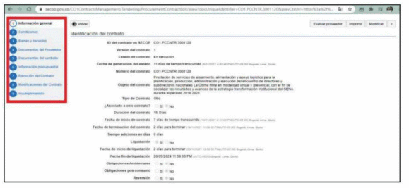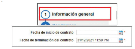Al momento de consultar el contrato como se indica en el numeral 2.2.3.1, debe verificar en la opción "1. Información General" los campos de "Fecha de inicio de contrato" y "Fecha de terminación del contrato":