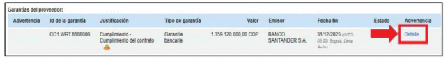 Posterior a esto, el profesional asignado debe ubicar la sección de "Garantías del Proveedor", verificar los datos generales de la garantía cargada y luego dar clic en "Detalle"(22):
