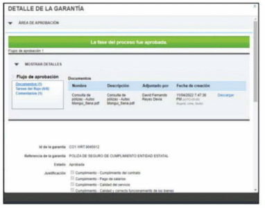 Se deber subir el documento en el flujo de aprobación en "documentos" mediante el cual se realizó la revisión de la póliza por la entidad, que se verá reflejado así: