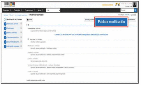 Cuando la modificación haya sido aprobada por las dos partes, el gestor o líder del proceso deberá dar clic en "publicar modificación", de no ser así no serán visibles los cambios realizados en el contrato: