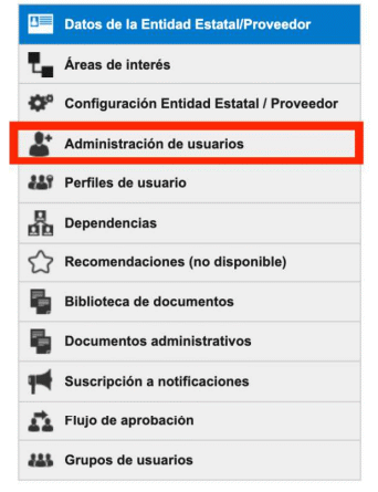 Posteriormente, se visualizará el menú del usuario coadministrador de la cuenta de la Entidad Estatal y se dará clic en la opción de "administración de usuarios" así: