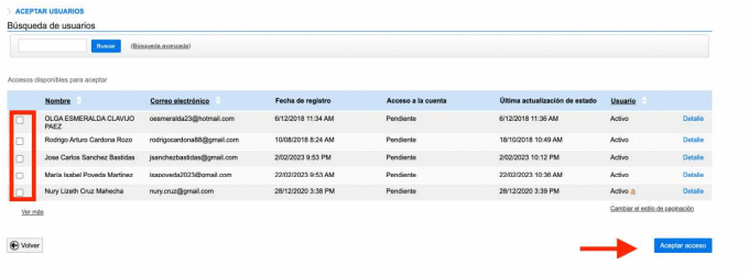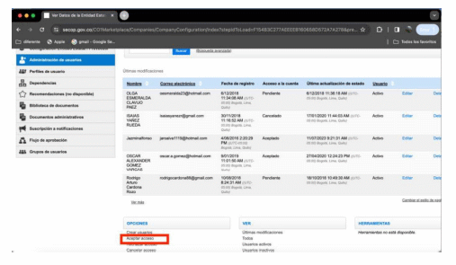 A continuación, se despliega una lista de usuarios que desean acceder a la cuenta de la Entidad Estatal, por lo cual puede seleccionar uno o varios en el costado izquierdo y luego dar clic en "Aceptar acceso" como se muestra a continuación: