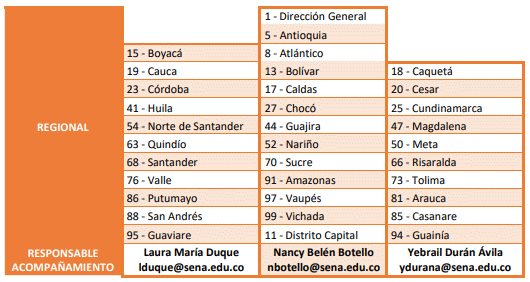 Las actividades concernientes a la estrategia de que trata la presente circular serán orientadas y controladas a nivel nacional por la Dirección Administrativa y Financiera, a través del Grupo de Almacenes e Inventarios. Para lo cual se ha designado acompañamiento a cada regional conforme a la siguiente distribución: