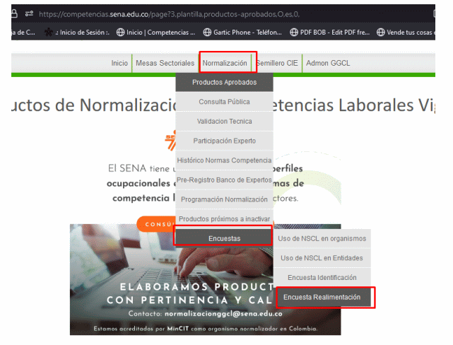 Pasos previos: diligenciamiento de la encuesta por parte de los usuarios de los productos de normalización en estado aprobado/publicado en el portal competencias.sena.edu.co