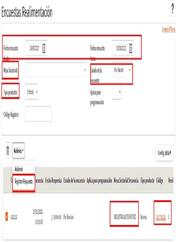Utilizando los filtros de búsqueda para especificar el producto y registrar respuesta (código del registro, por la mesa sectorial o estado por revisar.)