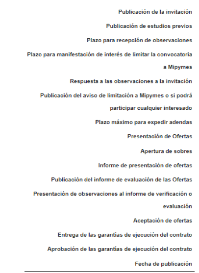 Cabe precisar, que estas fechas ya fueron incluidas por CCE en la plataforma SECOP II dentro de la sección de cronograma del proceso como se visualiza en la siguiente imagen: