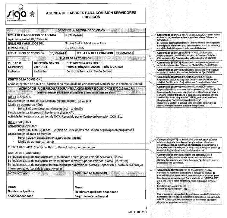 La información contenida en el "Formato agenda de labores para servidores públicos en comisión" deberá ser verificada previo a su radicación, teniendo en cuenta: destinos, itinerarios y trayectos, señalando los valores estipulados en la Resolución No. 1-01103 de 2023 por la cual se fija las escalas de viáticos y gastos de trasporte en el Sena.