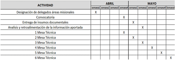 En el anexo al presente acápite se podrán encontrar de forma detallada y con su respectiva fecha distintas actividades como las mesas técnicas interinstitucionales que se han adelantado desde el mes de abril del 2025, las fechas límite para la entrega de insumos técnicos emanados de dichos espacios y los días destinados para revisión y retroalimentación de estos. En atención al artículo 5o del Acuerdo 003, del que emana esta circula, y de las demás disposiciones
