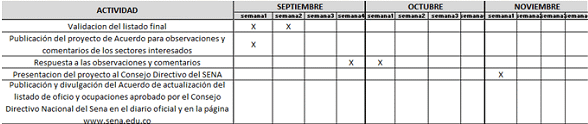 A manera de anexo a la presente circular, se podrá consultar de forma detallada el cronograma de actividades concerniente a la implementación del Acuerdo 003 de 2025. Así, esta planeación y definición de actividades, junto con sus fechas detalladas por semanas desde el mes de abril hasta el mes de diciembre del año en curso, delimita de manera clara las distintas fases y los distintos hitos a alcanzar en relación con la actualización del listado de oficios y ocupaciones.