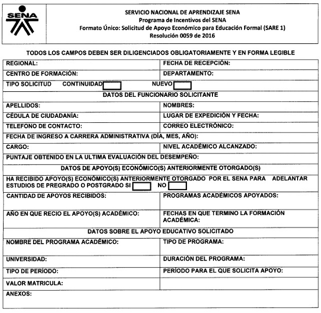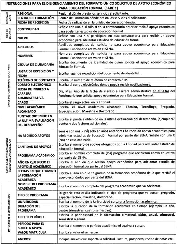 f) Presentar en las fechas establecidas en la respectiva convocatoria, el formato “único: solicitud de apoyo económico para educación formal (SARE 1)", y radicaría en el lugar donde el funcionario labore (Regional, Centro de Formación o Dirección General). Las solicitudes que sean radicadas fuera de las fechas establecidas y en otro formato no serán tenidas en cuenta.