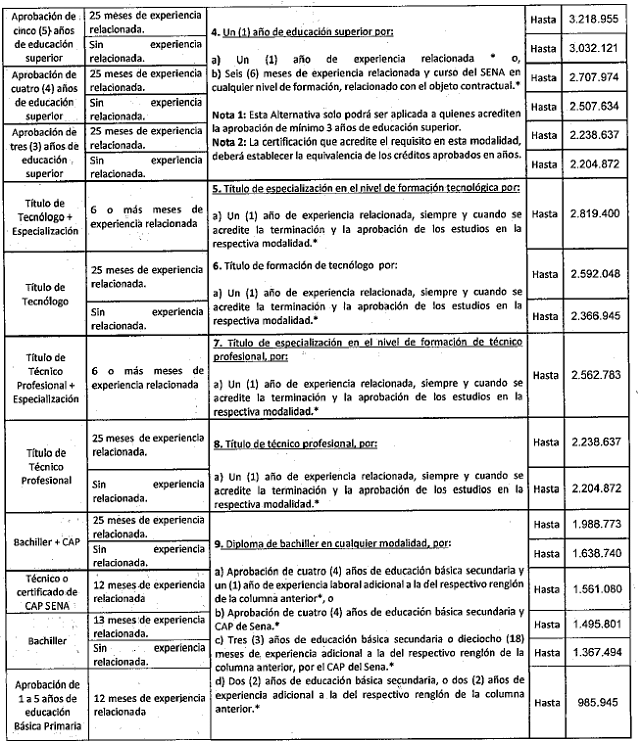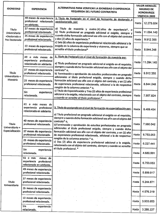 El valor de los honorarios se determinará teniendo en cuenta el objeto del contrato, las obligaciones a contraer, la formación académica y la experiencia relacionada que se requiere, dentro de los límites de la tabla que se indica a continuación; para establecer el valor de los honorarios no se tomará en cuenta todos los estudios y/o experiencia del futuro contratista, solamente la necesaria que se indicó previamente para satisfacer la necesidad, la cual se plasma en el estudio previo.