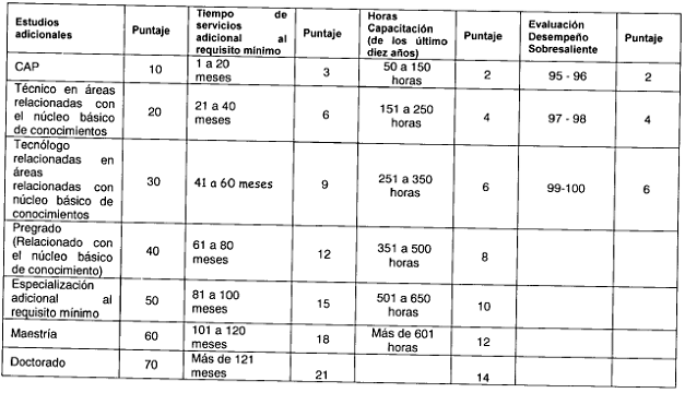 7. En caso de presentarse un empate entre dos o más servidores del mismo nivel jerárquico y grado, se han fijado los siguientes criterios de desempate y ponderaciones:
