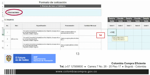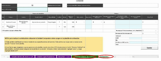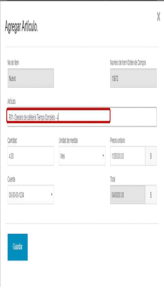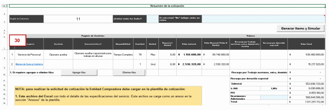 Ejemplo: La Entidad Compradora requiere adicionar el número operarios de cafetería de tiempo completo (línea 2 de la Orden de Compra), inicialmente la Entidad contrató dos (2) operarios por 9 meses. Al quinto mes de ejecución la Entidad Compradora requiere ingresar dos (2) nuevos operarios por el tiempo de ejecución restante de la Orden de Compra. El Proveedor le confirmó a la Entidad que le cobrará el mes de operación al mismo precio inicialmente pactado; en este caso la mensualidad de 1 solo operario es de $1.350.000.