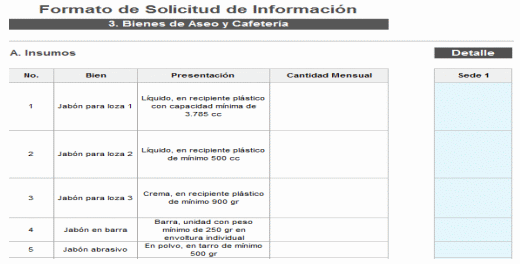 | 7 | Jabón de dispensador para manos 1 | - Con agente limpiador en una concentración mínima del 6% - Con agente humectante en una concentración mínima del 3% - pH entre 5,5 a 7 - Disponible en mínimo (2) dos fragancias | Líquido, en recipiente plástico con dispensador y capacidad mínima de 500 ml. | UNIFICAR CRITERIOS EN LA REGIONAL |