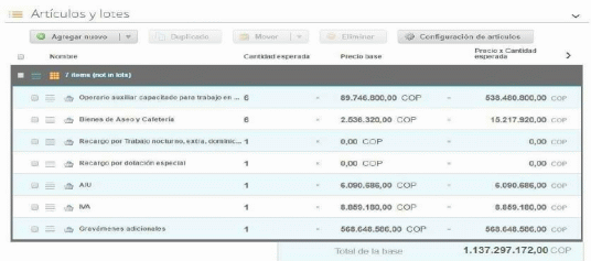 Este artículo está compuesto por dos variables: (i) cantidad que representa los meses por los cuales se contrata la adquisición de Bienes de Aseo y Cafetería y (ii) precio unitario que representa el valor promedio mensual del consumo de Bienes de Aseo y Cafetería.