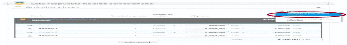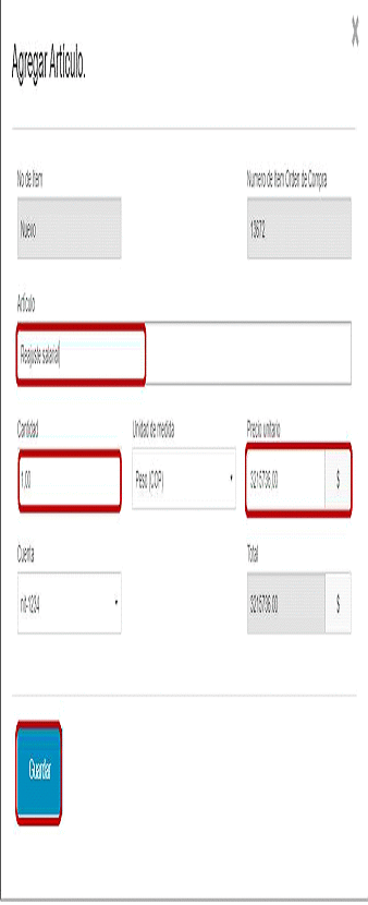 Para modificar la Orden de Compra por ajuste del incremento salarial[1] la Entidad Compradora en la sección “Artículos Actuales” debe seleccionar la opción “Agregar elemento” e ingresar como nombre del Artículo “Reajuste salarial”. Para calcular el monto total de “Reajuste salarial” la Entidad Compradora debe tener en cuenta para el cálculo del precio unitario: (i) el porcentaje (%) de ajuste de SMMLV aprobado por el gobierno y (ii) el total de Operarios en la Orden de Compra; y para el cálculo del campo cantidad el tiempo de ejecución restante de la Orden de Compra a partir del 1 enero del año en que se realiza el ajuste.