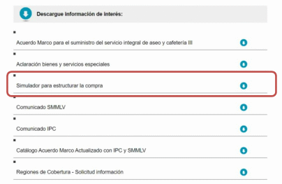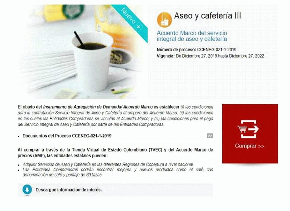 Colombia Compra Eficiente realizó el proceso de licitación CCENEG-021-1-2019 y suscribió el “Acuerdo Marco de Precios para la contratación del Servicio Integral de Aseo y Cafetería III”, el cual entro en vigencia el 27 de diciembre de 2019 y cuyo objeto es: (a) las condiciones para la contratación del Servicio Integral de Aseo y Cafetería al amparo del Acuerdo Marco; (b) las condiciones en las cuales las Entidades Compradoras se vinculan al Acuerdo Marco y adquieren el servicio Integral de Aseo y Cafetería; y (c) las condiciones para el pago del Servicio Integral de Aseo y Cafetería por parte de las Entidades Compradoras.