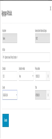 (i) En “Artículos Actuales” debe seleccionar lo que desea editar: (a) cantidad es decir el tiempo de duración ya sea en días o en meses; (b) la unidad de medida debe indicar si va a utilizar días o meses; (c) el precio unitario que corresponde a la sumatoria del precio mensual o diario para la cantidad de Operarios que haya definido en el artículo; y (d) la información presupuestal que soporta la modificación.