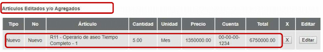 (iii) Para realizar una adición en la cantidad de metros cuadrados de zona verde a mantener, después de haber ejecutado algún tiempo de servicio, en “Artículo Actuales” debe: hacer clic en “Editar” en donde se encuentra la línea de jardinería y modificarla, indicando por cuanto tiempo fue requerido el servicio de jardinería inicialmente contratado y adicionar en una nueva línea la cantidad de metros cuadrados requeridos actualmente con el valor correspondiente.
