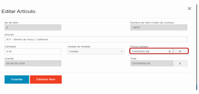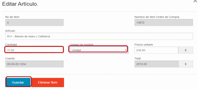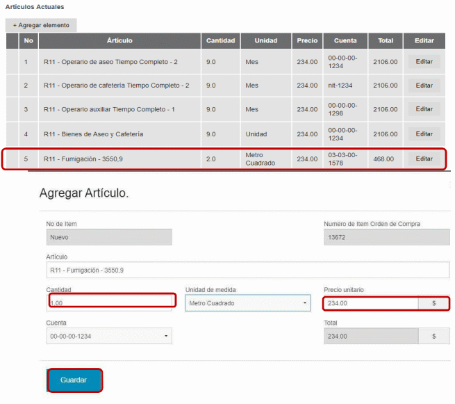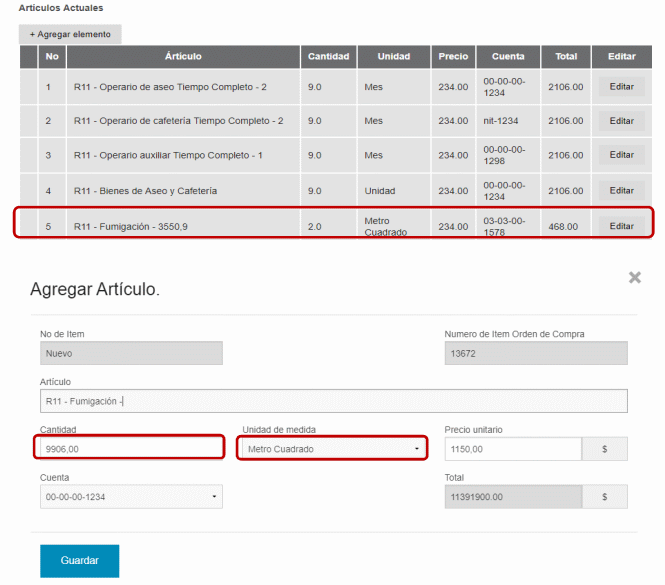 | 4 | 00-1234 | R11 - Bienes de Aseo y Cafetería | 9.0 | Unidad | 234,002.106,00 |