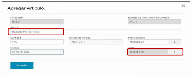 Para modificar la Orden de Compra por ajuste de variación del IPC[2], la Entidad Compradora debe hacer clic en la sección “+Agregar elementos” e ingresar como nombre del Artículo “Reajuste IPC - Servicios”. Para calcular el monto total de “Reajuste IPC - Servicios” la Entidad Compradora debe tener en cuenta para el precio unitario: (i) el porcentaje (%) de variación del IPC publicado por el DANE y (ii) el precio unitario de los Servicios Especiales; y para el cálculo del campo cantidad: la cantidad de fumigaciones pendientes para el Servicio de Fumigación y el tiempo de ejecución restante de la Orden de Compra a partir del 10 de enero de 2018.