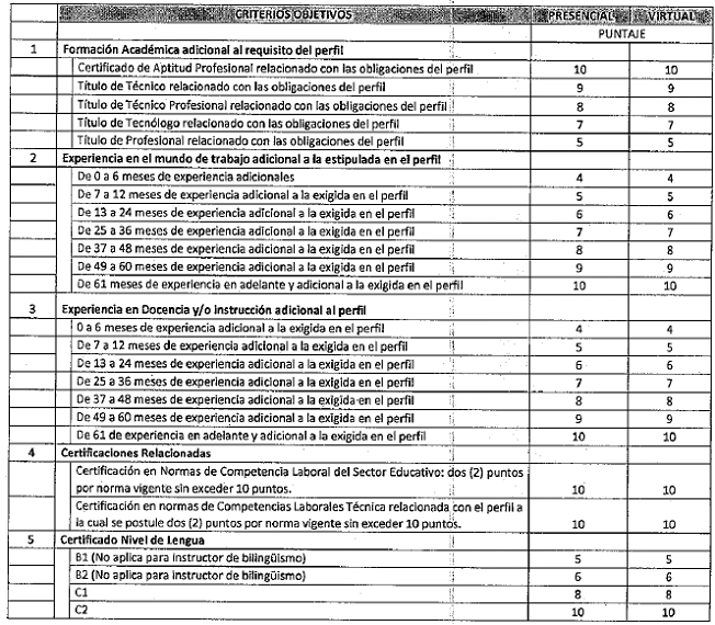 j. La tabla de criterios para realizar la valoración de la hoja de vida será la siguiente: