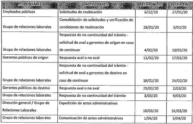Se informa el cronograma establecido para el trámite de las reubicaciones de personal de servidores públicos de la planta global permanente, de conformidad con la guía publicada en la plataforma Compromiso dentro de los documentos del proceso de talento humano con el código GTH-G-013 Versión:01, de la siguiente forma: