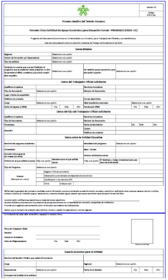 a. Inscripción: El Trabajador Oficial que cumpla con los requisitos señalados en la presente convocatoria, y desee iniciar o continuar con el beneficio para los programas de pregrado o posgrado, deberá diligenciar el "Formato Único de Solicitud Programa Educativo para Hijos de Funcionarios - PREGRADO" (Formato GTH-F -154-V.06), disponible en el siguiente enlace: