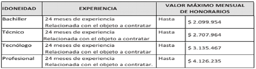 | TIPO | IDONEIDAD | EXPERIENCIA | VALOR MÁXIMO MENSUAL DE HONORARIOS |