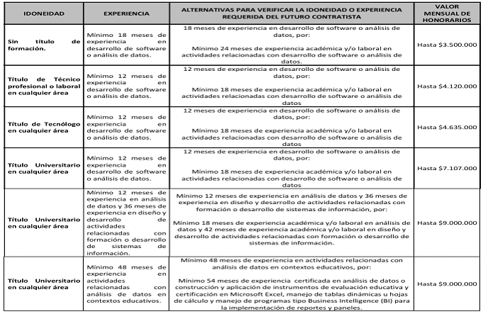 | Ingeniero deDesarrollo | TítuloUniversitario en cualquier área de conocimiento | Mínimo doce (12) meses de experiencia certificada en administración de bases de datos (DBA), desarrollo de software, aseguramiento de la calidad de software (QA) o análisis de datos, con participación en actividades relacionadas con la implementación, configuración, monitoreo y optimización de bases de datos relaciónales o no relacionales, garantizando la integridad,disponibilidad y seguridad de la información. | Mínimo doce (12) meses de experiencia certificada enadministración de bases de datos (DBA), desarrollo de software, aseguramiento de la calidad de software (QA) o análisis de datos | Hasta$8.000.000 |