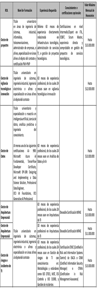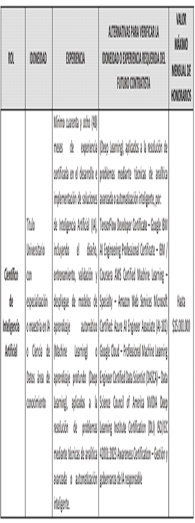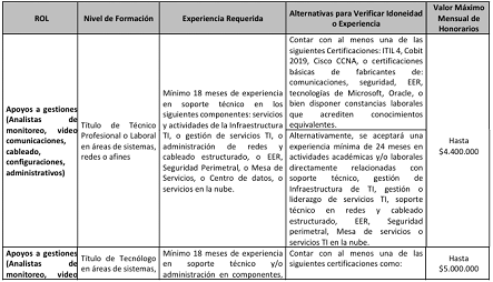 | ROL | IDONEIDAD | EXPERIENCIA | ALTERNATIVAS PARA VERIFICAR LA IDONEIDAD O EXPERIENCIA REQUERIDA DEL FUTURO CONTRATISTA | VALORMÁXIMOMENSUAL DEHONORARIOS |
