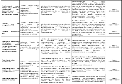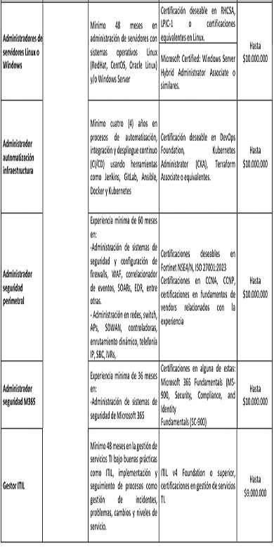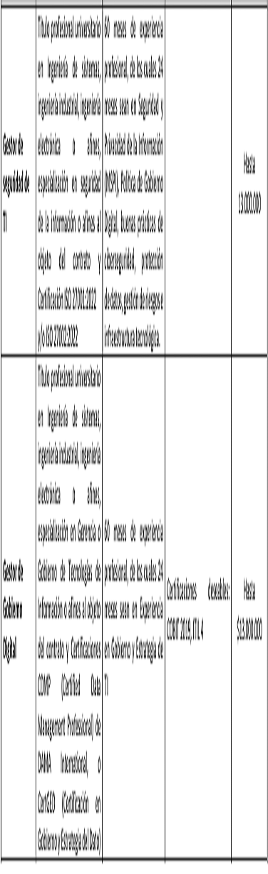 | Arquitecto de Datos | Contar con al menos cuarenta y ocho (48) meses de experiencia certificada en administración de bases de datos (DBA) o desarrollo de software, y formación de nivel de maestría en disciplinas relacionadas con ingeniería de sistemas, informática o áreas afines. | Hasta$10.000.000 | ||