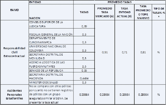 Para ellos se recopilan las tasas bajo las cuales diferentes entidades han contratado programas de seguros que contienen pólizas similares a las que contratarán y se obtiene el promedio aritmético de esas tasas. Cabe anotar que para realizar tal cálculo se desestiman las tasas que generen una desviación significativa del promedio y que su mayor costo obedece a situaciones particulares de la entidad estatal analizada y no a situaciones normales del mercado.