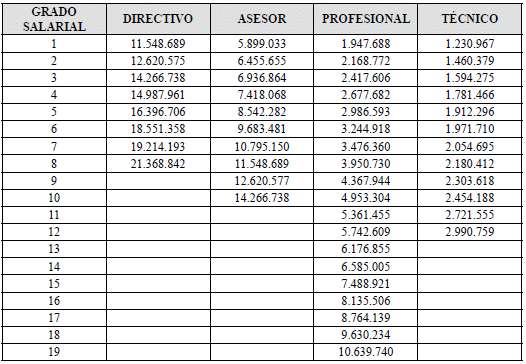 | GRADO SALARIAL | DIRECTIVO | ASESOR | PROFESIONAL | TÉCNICO | ASISTENCIAL |