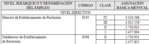 ARTÍCULO 30. ASIGNACIÓN BÁSICA DIRECTOR Y SUBDIRECTOR DE ESTABLECIMIENTO DE RECLUSIÓN. <Decreto derogado por el artículo 40 del Decreto 1011 de 2019> A partir del 1 de enero de 2018, fíjase la siguiente escala de asignaciones básicas mensuales para los empleos de Director y Subdirector de Establecimiento de Reclusión: