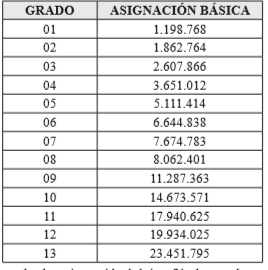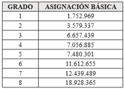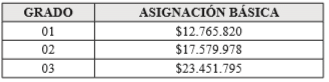 PARÁGRAFO 1o. En la escala de asignación básica fijada en el presente artículo la primera columna señala los grados de remuneración y la segunda indica la asignación básica mensual establecida para cada grado.