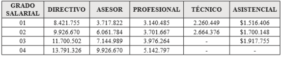 PARÁGRAFO 1o. Para las escalas de los niveles de que trata el presente artículo, la primera columna fija los grados salariales correspondientes a las diferentes denominaciones de empleos, la segunda y siguientes columnas comprenden las asignaciones básicas mensuales para cada grado y nivel.