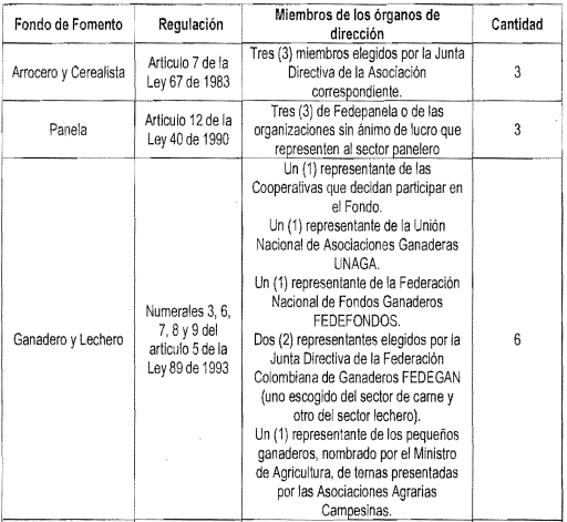 PARÁGRAFO. Para la elección de los miembros de órganos de dirección de fondos de fomento a las que se refieren el parágrafo del artículos 10 de la Ley 138 de 1994 (Fondo de Fomento Palmero); parágrafo del artículo 17 de la Ley 686 de 2001 (Fondo de Fomento Cauchero), modificado por el artículo 8o de la Ley 1758 de 2015; y el parágrafo del artículo 9o de la Ley 534 de 1999 (Fondo Nacional del Tabaco), estas se realizarán cumpliendo las garantías de representación mínima previstas en el artículo 2.10.4.1.8.