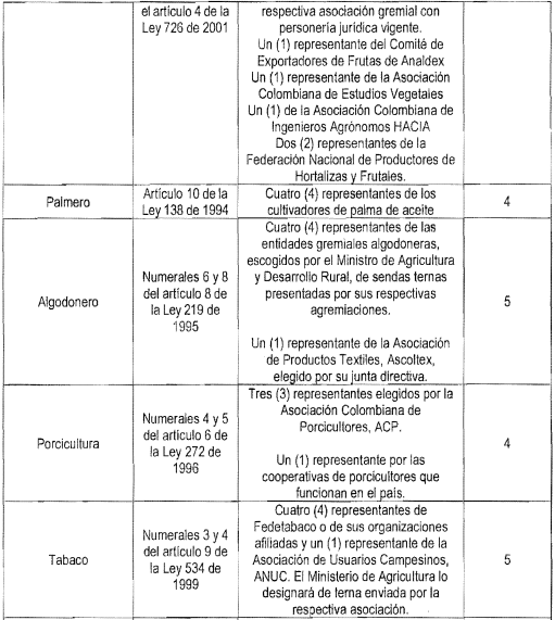 - Artículo 16 de la Ley 118 de 1994 modificado por el artículo 4o de la Ley 726 de 2001 (Fondo Nacional de Fomento Hortifrutícola);