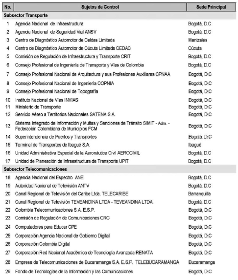 ARTÍCULO 6o. CONTRALORÍA DELEGADA PARA EL SECTOR INFRAESTRUCTURA FÍSICA Y TELECOMUNICACIONES, COMERCIO EXTERIOR Y DESARROLLO REGIONAL. <Resolución derogada por el artículo 31 de la Resolución 62 de 2020> La Contraloría Delegada para el Sector Infraestructura Física y Telecomunicaciones, Comercio Exterior y Desarrollo Regional, será competente para ejercer la vigilancia y el control fiscal a los siguientes sujetos de control: