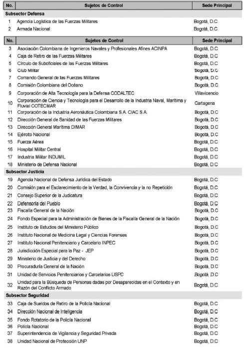 ARTÍCULO 4o. CONTRALORÍA PARA EL SECTOR DEFENSA, JUSTICIA Y SEGURIDAD. <Resolución derogada por el artículo 31 de la Resolución 62 de 2020> La Contraloría Delegada para el Sector Defensa, Justicia y Seguridad será competente para ejercer la vigilancia y el control fiscal a los siguientes sujetos de control: