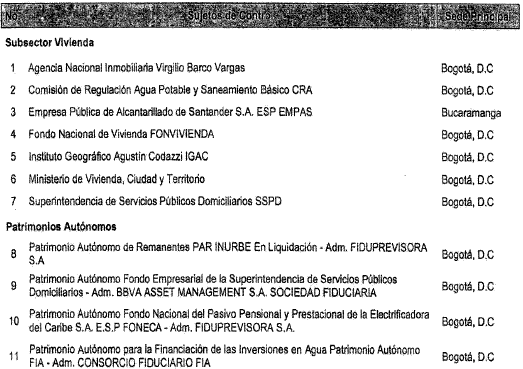 ARTÍCULO 15. CONTRALORÍA DELEGADA PARA EL SECTOR VIVIENDA Y SANEAMIENTO BÁSICO. La Contraloría Delegada para el Sector Vivienda y Saneamiento Básico será competente para ejercer la vigilancia y el control fiscal a las siguientes entidades:
